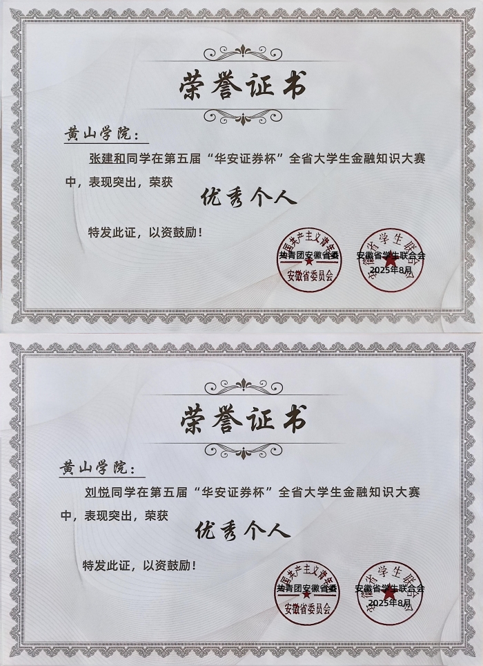 近日,由团省委、省学联联合华安证券股份有限公司共同主办的第五届“华安证券杯”安徽省大学生金融知识大赛圆满落幕,365官网张建和、刘悦两名同学双双荣获“优秀个人”荣誉称号。