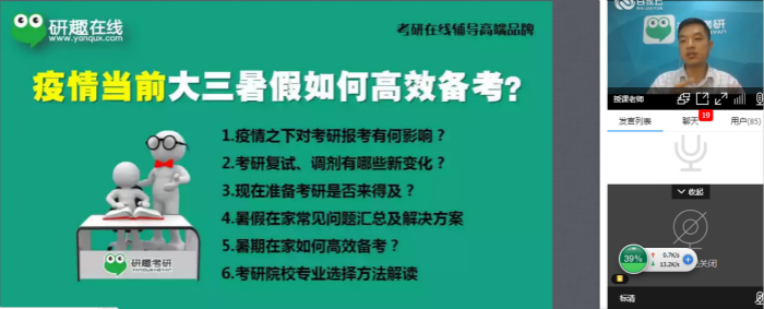 朱小曼以幽默的口吻向同学们介绍疫情影响下考研复试的状况,并提供了详细的暑假备考计划,同时对考研院校专业选择方法进行解读。他希望同学们在居家学习的状态下仍能够认真刻苦学习,不断提升自身能力,圆自己的考研梦。长达一个半小时的考研暑假备考交流会在同学们的积极参与中圆满结束。