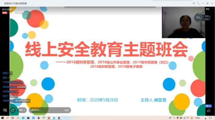 5月26日晚,beat365中国唯一官方网站16级财务管理、16级公共事业管理、17级市场营销对口、18级财务管理以及18级电子商务五个班通过钉钉顺利召开安全主题班会,会议由18财管安全委员阚登雪主持。