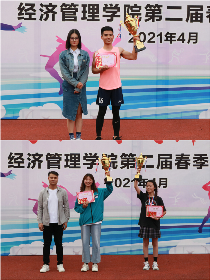 4月18日下午,主持人宣布比赛结果:女子个人积分前三名分别是吴小婉、陈恩琪、乔敏慧,男子个人积分前三名的分别是余俊杰、高群、梅涛。班级前六名分别是2019级市场营销对口班、2020级市场营销对口班、2019级电子商务班、2020级财务管理班、2019级国际经济与贸易班、2018级国际经济与贸易班。在热烈的气氛中,参加闭幕式的同学绕场奔跑,以运动的方式祝贺院首届春季运动会胜利闭幕。