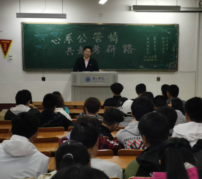 17公管班后鹏同学首先分享了他考研成功上岸的经历:主要就考研的重要性、考研的学习方法、考研的时间规划安排以及考研心态等四个方面介绍考研的有关知识;随后,17级公共事业管理班班长胡玉同学分享了自己的考公经历:主要从考公的目的和考公的理想担当、历史使命等向同学们介绍了考公的有关知识;认为考研和考公很大的一个区别点在于考研更注重的是专业知识,而考公则对知识面有更高的要求。最后,胡玉引用了王勃《滕王阁序》中的一句话来激励我们:“老当益壮,宁移白首之心。穷且益坚,不坠青云之志。”